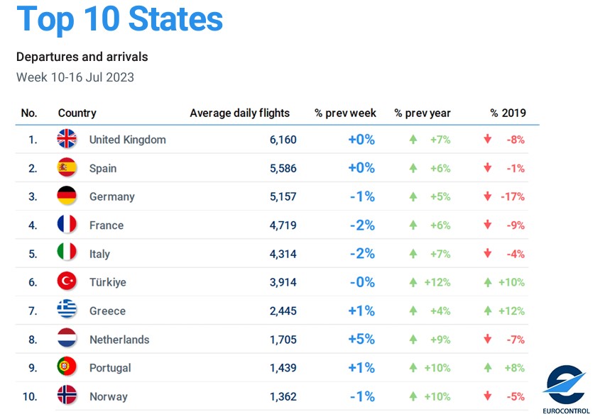 EUROCONTROL tarafından yayınlanan Avrupa Havacılık Genel Bakış Raporu, 10-16 Temmuz 2023 döneminde Avrupa’da hava trafiğinin yoğunlaştığını gösteriyor.
