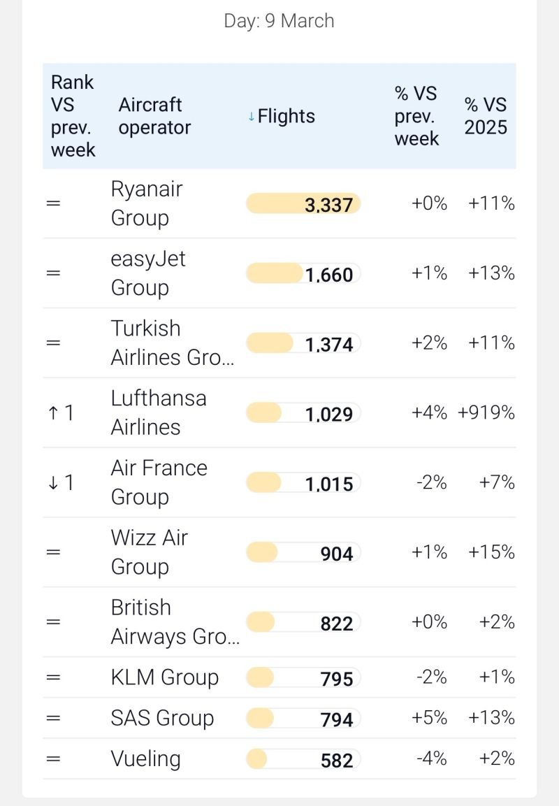 9 Mart günü Avrupa’nın en yoğun havayolu operatörleri açıklandı. Ryanair – Europe’s Favourite Airline 3.337 uçuşla zirvede yerini korurken, easyJet ve Türk Hava Yolları güçlü artışlarla ilk üçteki yerlerini sağlamlaştırdı.