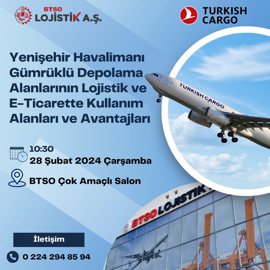 BTSO Lojistik A.Ş. ve Turkish Cargo’nun iş birliğiyle düzenlenecek olan “Yenişehir Havalimanı Gümrüklü Depolarının Hava, Kara, Deniz Lojistiğinde ve E-Ticarette Kullanım Alanları ve Avantajları” bilgilendirme toplantısına katılın.