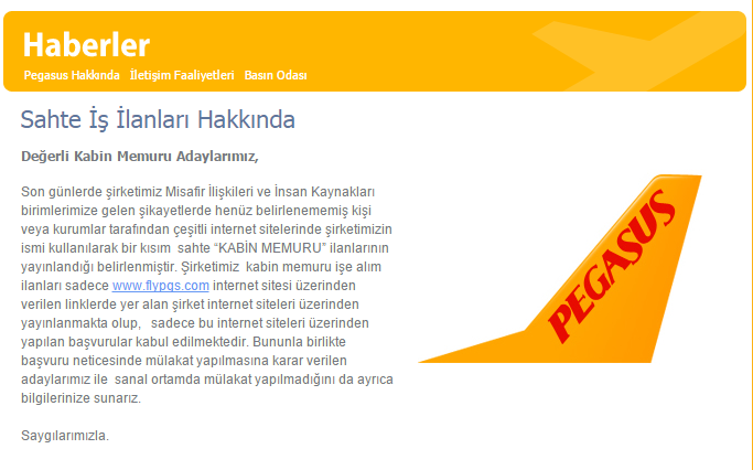 Pegasus Havayolları Sahte İş İlanları Konusunda Uyardı Sahte İş İlanları Hakkında Pegasus Havayolları’nın yapmış olduğu açıklama Değerli Kabin Memuru Adaylarımız, Son günlerde şirketimiz Misafir İlişkileri ve İnsan Kaynakları birimlerimize gelen şikayetlerde henüz belirlenememiş kişi veya kurumlar tarafından çeşitli internet sitelerinde şirketimizin ismi kullanılarak bir kısım  sahte “KABİN MEMURU” ilanlarının yayınlandığı belirlenmiştir. Şirketimiz