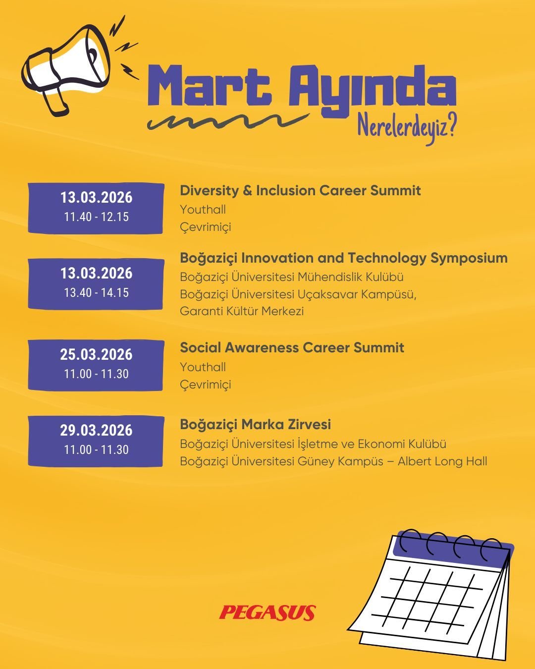 Pegasus, gençlere ilham vermek ve farklı kariyer yollarını tanıtmak için bu ay da kampüslerde ve dijital dünyada yerini alıyor. Havacılık sektörünün dinamizmini keşfetmek isteyen herkes için kaçırılmayacak fırsatlar! 🚀