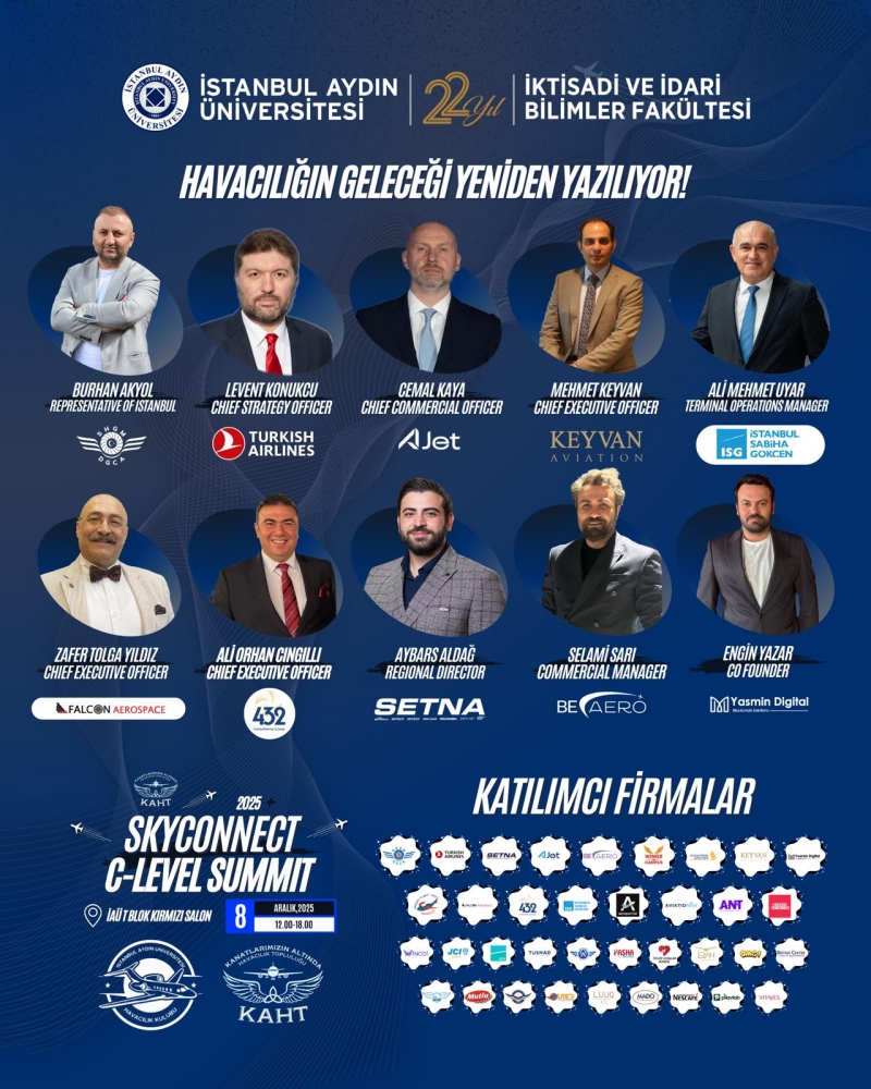Kanatlarımızın Altında Havacılık Topluluğu, havacılık dünyasının zirvesini ikinci kez buluşturuyor. Sektörün üst düzey yöneticilerini (C-Level) bir araya getiren SKYCONNECT C-Level Summit, 8 Aralık Pazartesi 2025 tarihinde İstanbul Aydın Üniversitesi T Blok Necdet Timur Oditoryum Salonu’nda düzenlenecek. Dijitalleşme, sürdürülebilirlik, yapay zekâ uygulamaları ve yeni nesil mobilite çözümleri gibi kritik başlıkların ele alınacağı zirve, havacılığın geleceğine ışık tutacak.