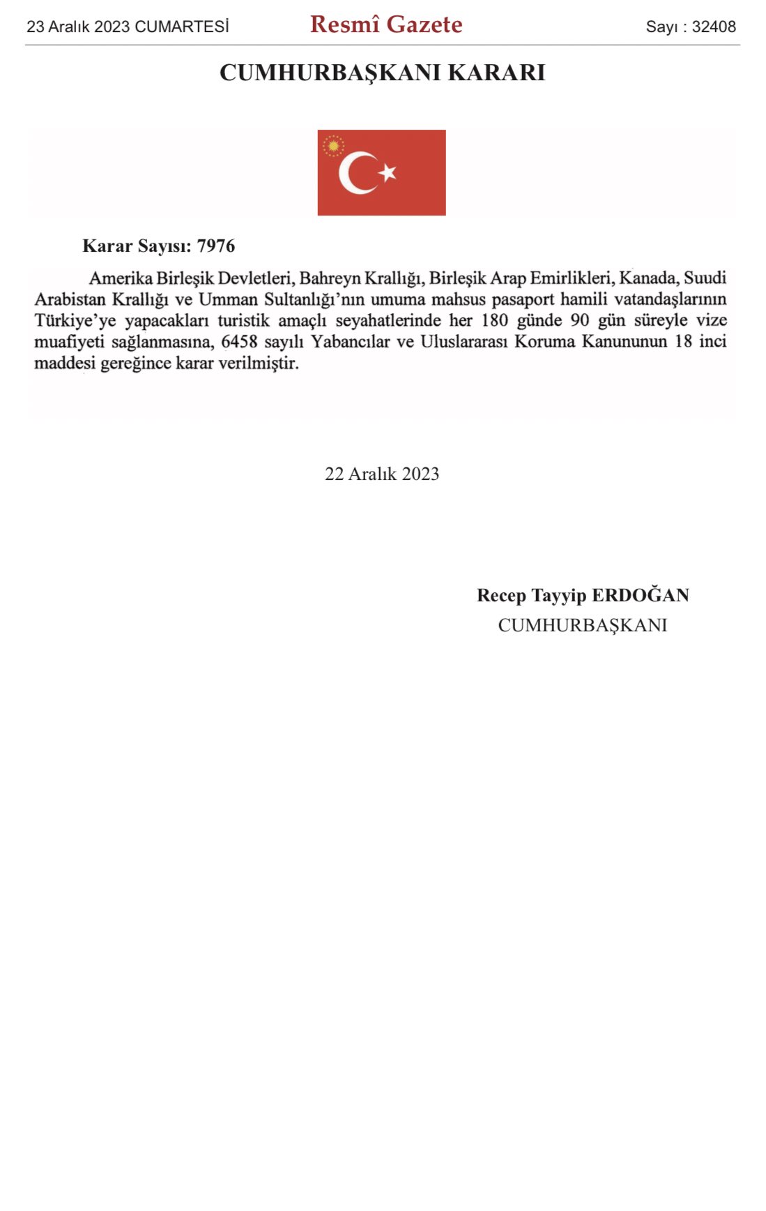 Resmi Gazete, Amerika Birleşik Devletleri, Bahreyn Krallığı, Birleşik Arap Emirlikleri, Kanada, Suudi Arabistan Krallığı ve Umman vatandaşlarını turizm amaçlı Türkiye’ye giriş vizesinden muaf tutan bir Cumhurbaşkanlığı Kararnamesi yayınladı. Muafiyet, her 180 günün 90 günü boyunca normal pasaporta sahip olan vatandaşları kapsamaktadır.