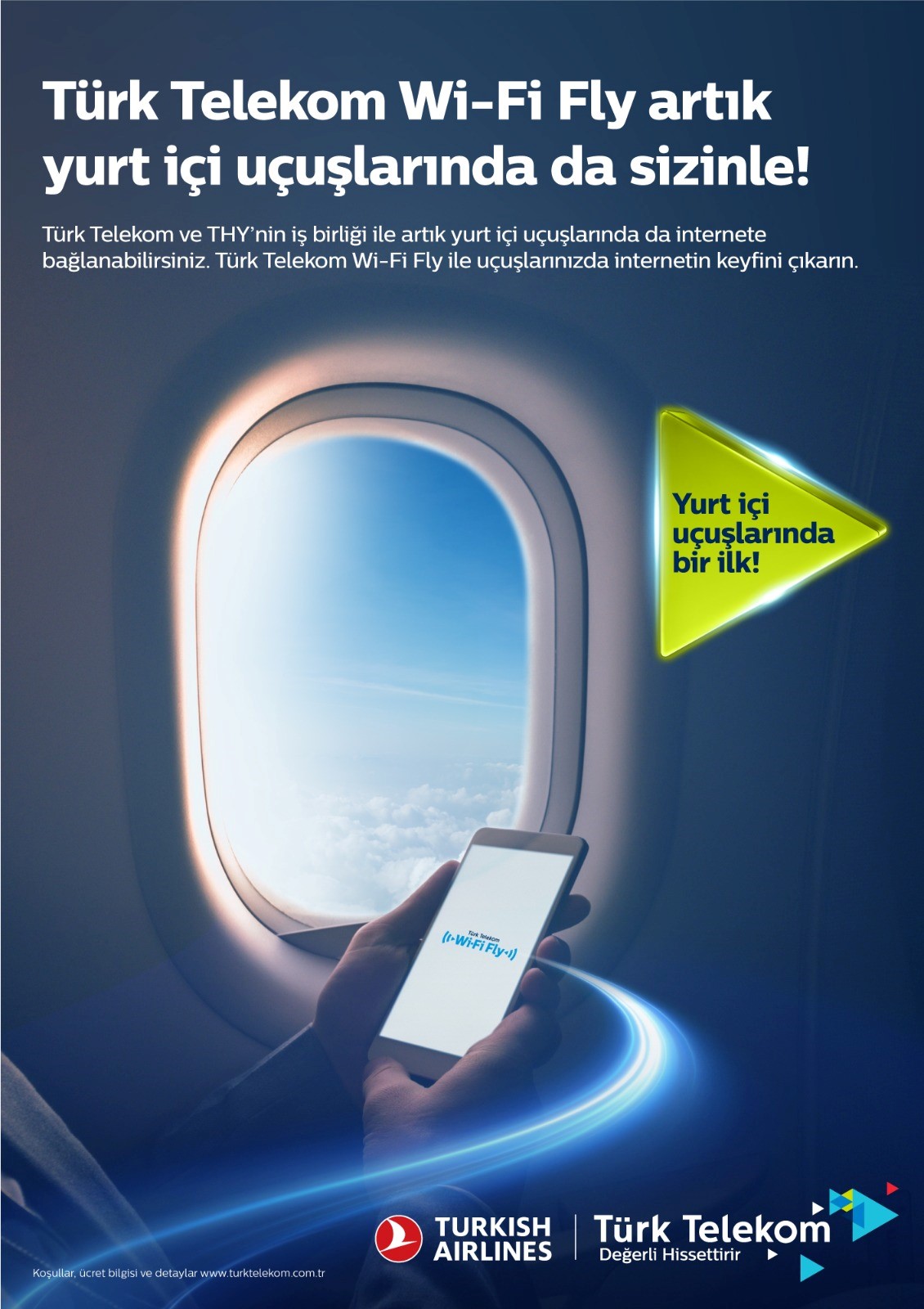 Türk Telekom, müşteri deneyimini zenginleştirmek adına Türk Hava Yolları (THY) iş birliği ile dış hatlar uçuşlarında sağladığı Türk Telekom WiFi Fly’ı artık yurt içi uçuşlarında da yolcuların kullanımına sunuyor. Yolcular WiFi özelliği olan dizüstü, bilgisayar, tablet veya akıllı telefonlardan uçuş sırasında mesajlaşma ya da internet seçenekleri sayesinde havada da internete erişebilecek.